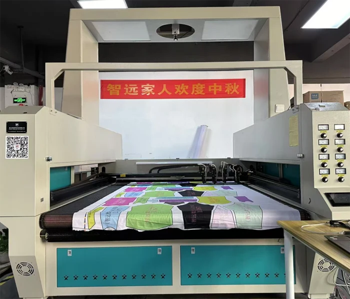 १) थर्मल सबलीमेशन स्पोर्ट्सवेअर: थर्मल सबलिमेशन स्पोर्ट्सवेअरच्या प्रक्रियेसाठी, पॅनोरामिक व्हिजन लेसर कटिंग मशीन नमुना आणि कपड्यांच्या आवृत्तीमधील परिपूर्ण फिट सुनिश्चित करण्यासाठी विविध क्रीडा घटक, ब्रँड लोगो आणि इतर नमुन्यांसह मुद्रित फॅब्रिक्स अचूकपणे कट करू शकते. त्याच वेळी, वेगवेगळ्या आकाराच्या आणि स्पोर्ट्सवेअरच्या वेगवेगळ्या शैलींच्या छोट्या बॅच सानुकूलनाच्या गरजा भागविल्यास, ग्राफिक्सच्या रिअल-टाइम फेरबदल आणि विविध प्रक्रियेच्या स्वरूपाच्या फायद्यांना समर्थन देऊन ते कटिंग योजना द्रुतपणे समायोजित करू शकते, जेणेकरून वैयक्तिकृत सानुकूलनाची आवश्यकता पूर्ण होईल आणि स्पोर्ट्सवेअरची एकूण सौंदर्य आणि व्यावसायिकता सुधारली जाईल.